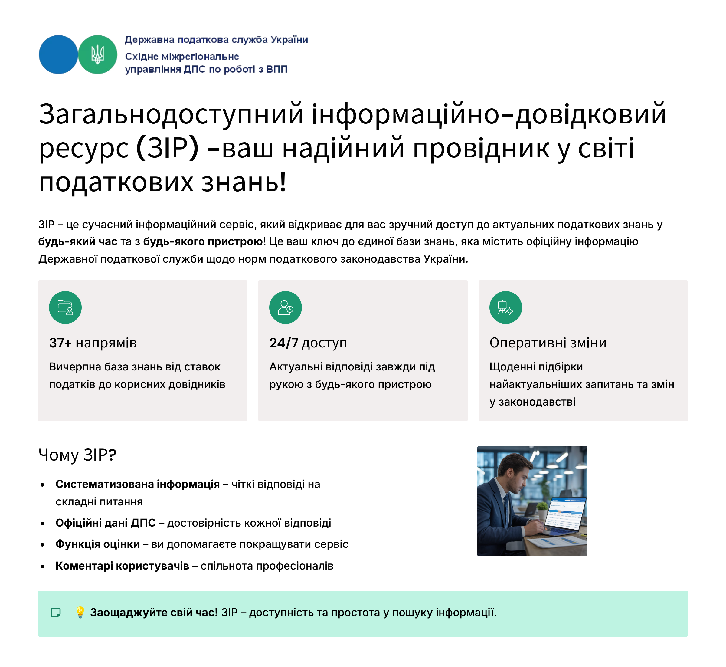 Загальнодоступний інформаційно-довідковий ресурс (ЗІР) – це сучасний інформаційний сервіс, який відкриває для вас зручний доступ до актуальних податкових знань у будь-який час та з будь-якого пристрою!