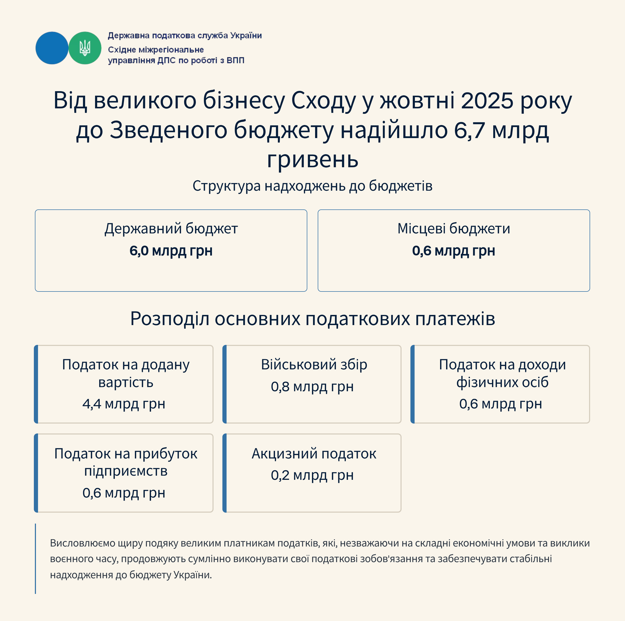Протягом жовтня 2025 року збір платежів до Зведеного бюджету України (без урахування єдиного внеску) становив 6,7 млрд гривень. До Державного бюджету України підприємствами, які перебувають на обліку у Східному міжрегіональному управлінні ДПС по роботі з великими платниками податків, сплачено  6,0 млрд грн та 0,6 млрд гривень до місцевих бюджетів.
