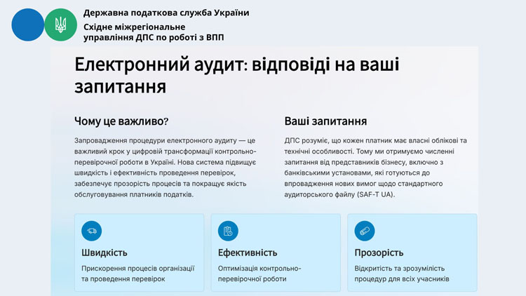 Е-аудит — це швидкість, зручність та прозорість під час організації та проведення податкових перевірок. Такий формат дозволяє суттєво підвищити ефективність контрольно-перевірочної роботи, а також покращити якість взаємодії між ДПС та бізнесом.