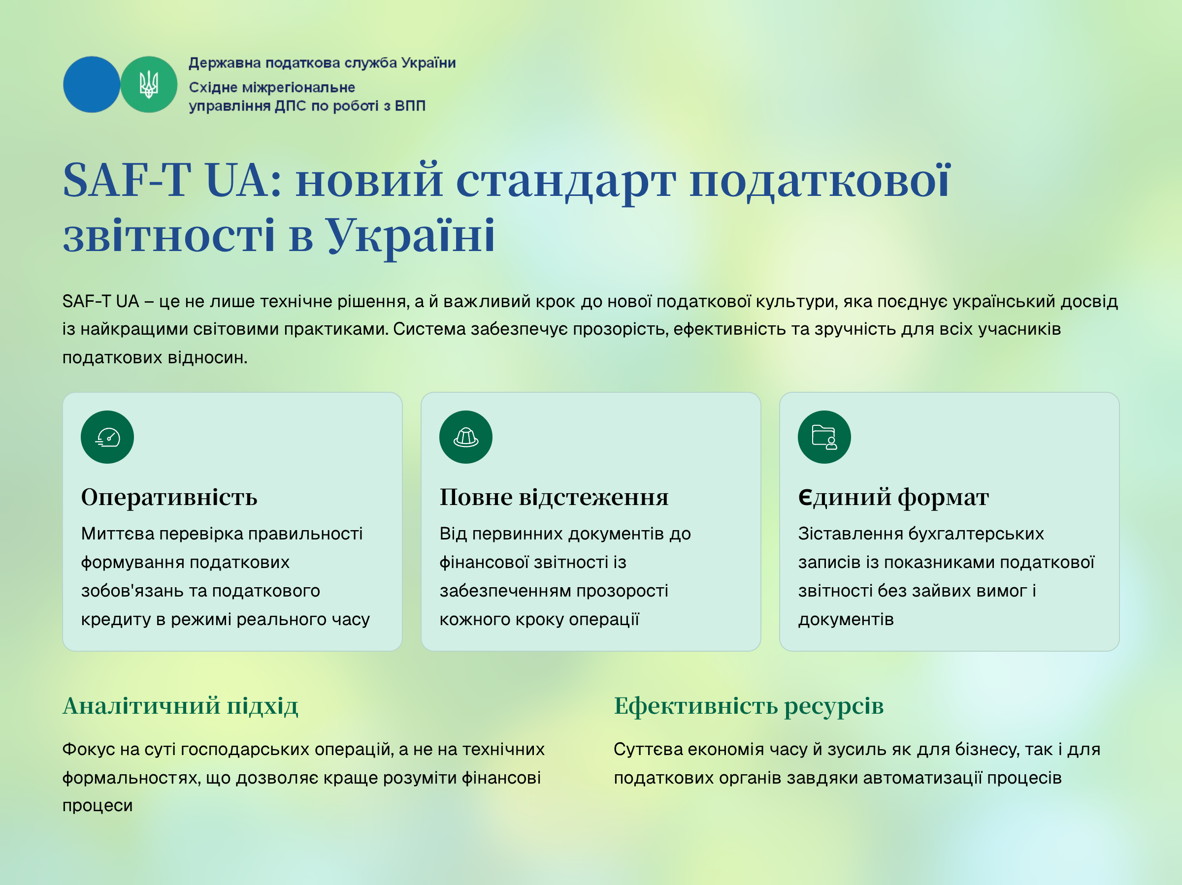 Впровадження європейських стандартів у діяльність податкових органів потребує якісного та послідовного підходу. Так, для зручності платників на вебпорталі ДПС створено банер «SAF-T UA», в якому зібрано інформацію щодо стандартного аудиторського файлу.