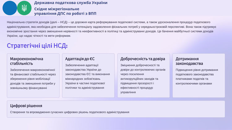 Національна стратегія доходів (далі – НСД) – це дорожня карта реформування податкової системи, а також удосконалення процедур податкового адміністрування, яка необхідна для забезпечення потенціалу задоволення фіскальних потреб у середньостроковій перспективі. Вона також підтримує економічне зростання через зменшення нерівності та неефективності в політиці та адмініструванні доходів. Це бачення майбутньої системи доходів України, що надає чіткості та мети реформам.